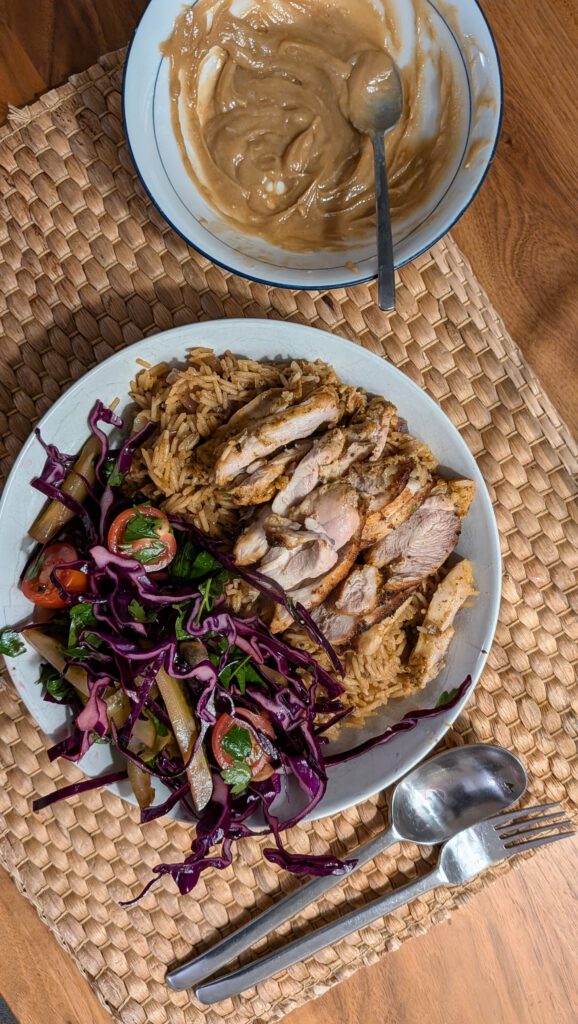 Check na 9-10min of de rijst goed is gegaard en al het vocht is opgedroogd. Als dat zo is haal je de pan van het vuur en de kipdij haal je uit de pan en leg je op een snijplank. Snij de kip in smalle reepjes. Meng met een lepel de rijst in de pan door. Als je van kruidig houdt kun je nog wat extra shawarma kruiden door de rijst mengen.