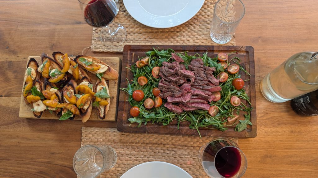 Pak je mooiste schaal of snijplank en beleg deze met de rucola salade. Snij de steak in dunne plakjes en leg deze op de salade. Gebruik ook een snijplank of borrelplank voor je bruschetta.